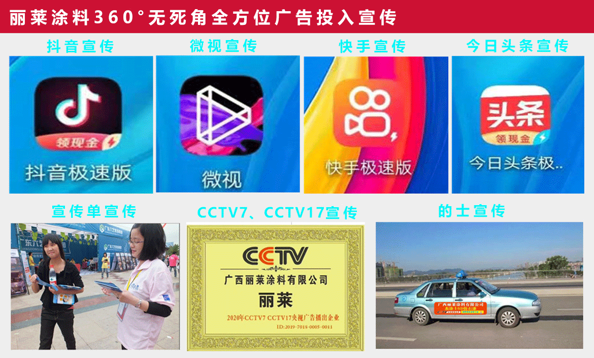 麗萊涂料持續(xù)投入數(shù)千萬(wàn)元,在央視、地方衛(wèi)視、報(bào)紙、雜志、戶(hù)外路牌等各大傳統(tǒng)媒體進(jìn)行不間斷的形象廣告宣傳,在全球知名的阿里巴巴、新浪、網(wǎng)易、搜狐、慧聰、鳳凰網(wǎng)、中國(guó)建材網(wǎng)等新媒體進(jìn)行全方位立體式傳播,關(guān)注健康生活,關(guān)注環(huán)保建設(shè),迅速提升品牌知名度和美譽(yù)度。